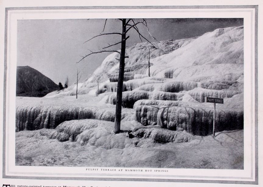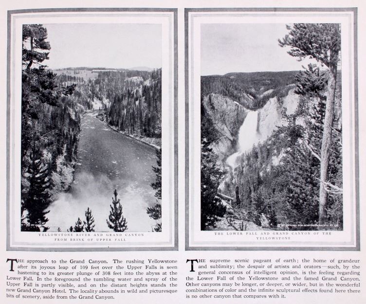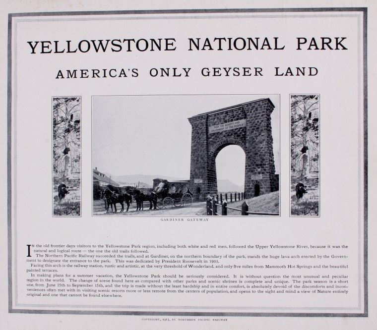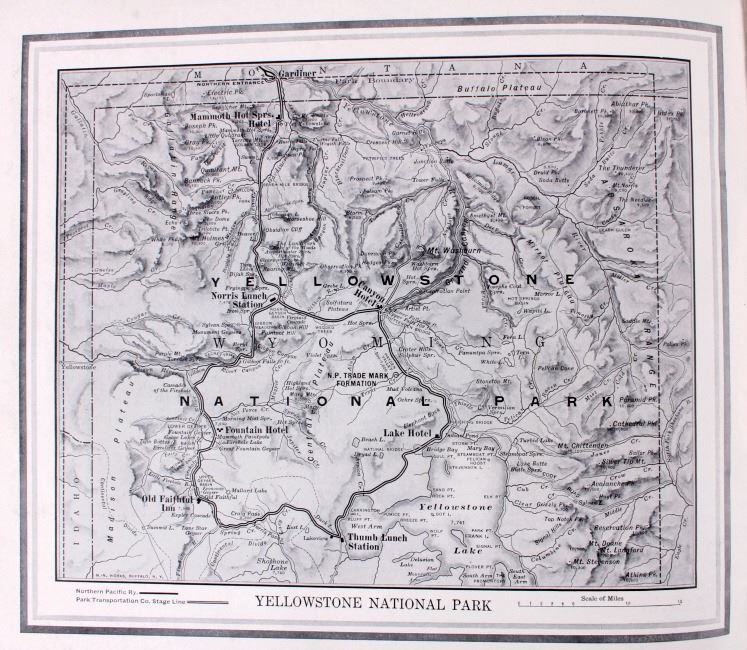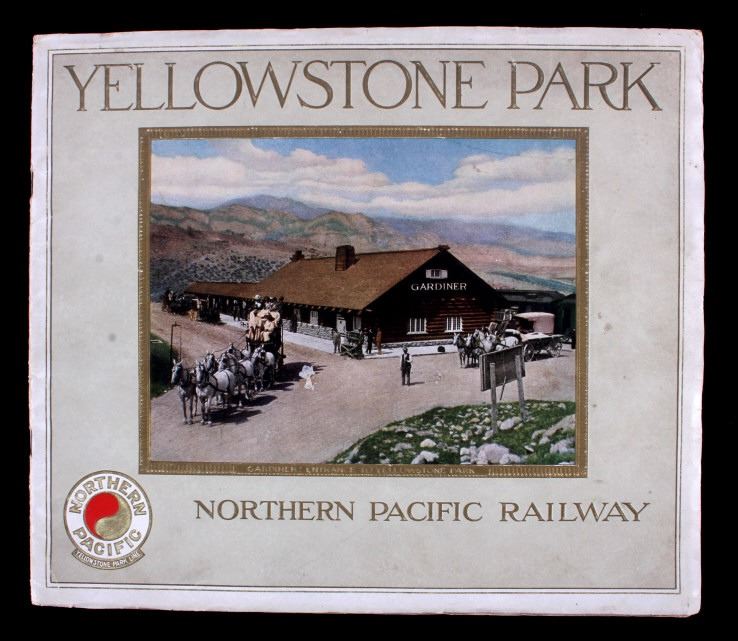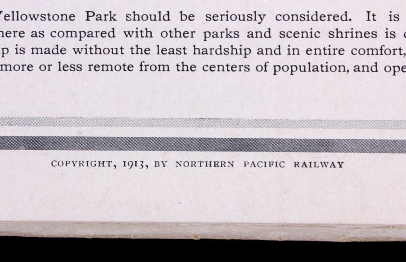 This is a 1913 Northern Pacific Yellowstone Park Line souvenir book. The book features many photos, illustrations and maps of Yellowstone and routes traveled by the railroad. The souvenir book is in good overall condition. It measures 9" x 10.5".