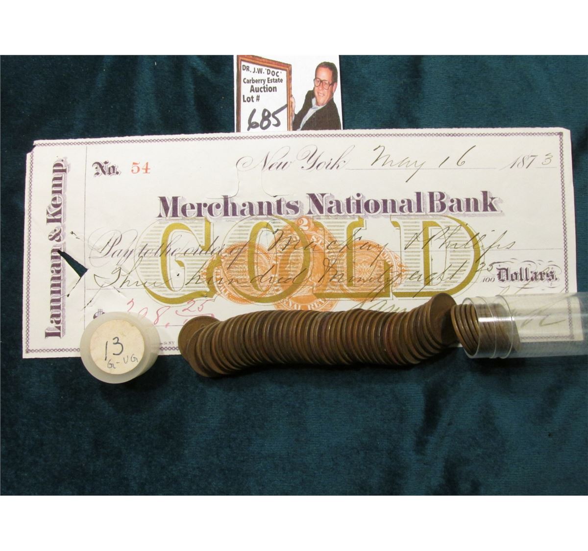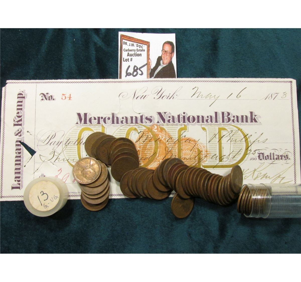 1913 P Roll of U.S. Wheat Cents in circulated condition in a plastic tube, approx. 50 pcs.; & 1873 Check drawn on Merchants National Bank in New York, "GOLD' center with Internal revenue Prestamp.