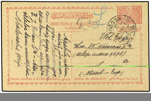 1913 Postal stationary card 20 para rose cancelled by bilingual MECQUE 2 datestamp (Coles & Walker 25) addressed to Holland with AMSTERDAM arrival. Scarce.