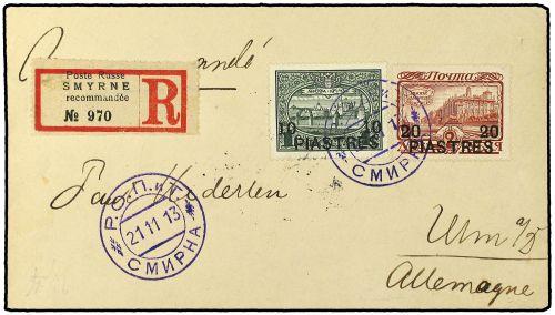 1913 Registered envelope to Ulm, Germany, franked "10 piastres" on 1r., and "20 Piastres" on 2r Romanov, tied by R.O.P.I.T. SMYRNE date stamp. Russian P.O. Constantinople transit cds on reverse.