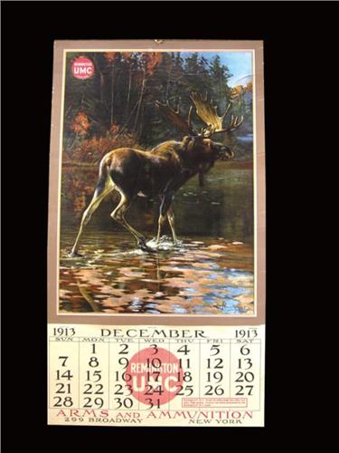 1913 Remington UMC Calendar, band on top, December page only. Carl Runguis artist depicting moose in the river. Framed and matted. Small hole at 12:00, minor creases on edges otherwise excellent original condition. Image 15 X 27 inches.