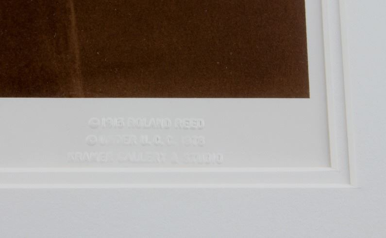 For your consideration is an Roland Reed Photogravure c.1913, 30/450. Roland Reed (1864-1934) is a well known photographer from the late 1800's to the early 1900's whose travels took him to Montana, Alaska, Minnesota, Texas, and New Mexico. As an American artist and photographer, Reed was part of an early 20th century group of photographers of Native Americans known as pictorialists. Reed developed an early affinity for Native Americans through associations he had with neighboring Indians while growing up. He also fostered a thirst for adventure that would stay with him throughout his life. This piece shows a portrait of a Native American Chief in full headdress, wrapped in a blanket. This piece shows raised stamped text indicating "© 1913 Roland Reed / © Under U.C.C. 1978 / Kramer Gallery Studio" This piece is professionally framed by measuring 23x27" with the visible art measuring 15 1/4" x 19 1/2."