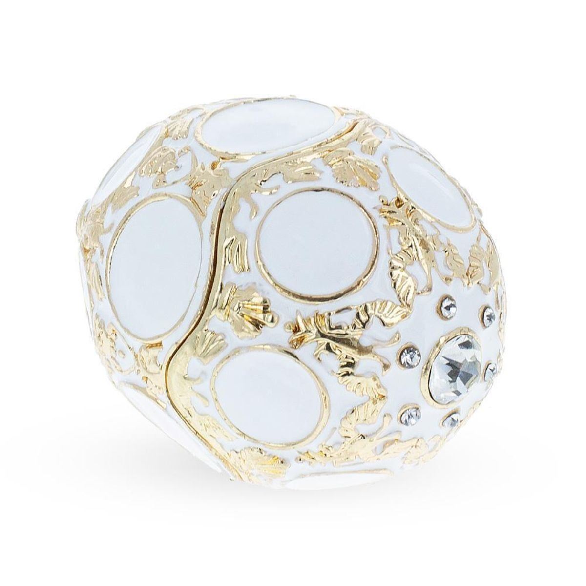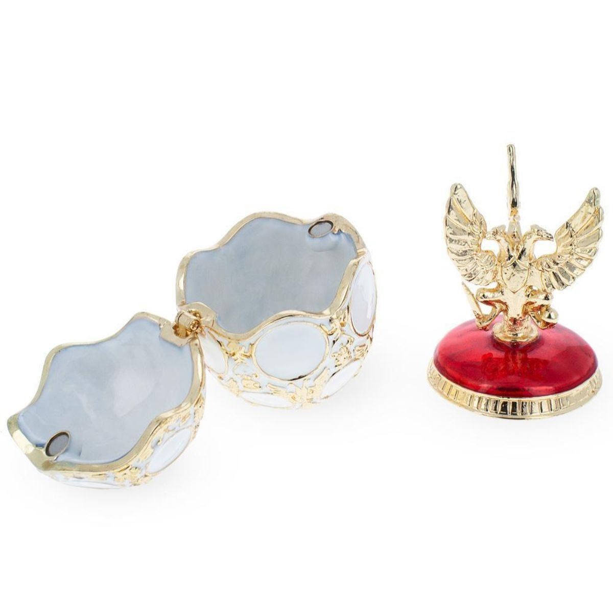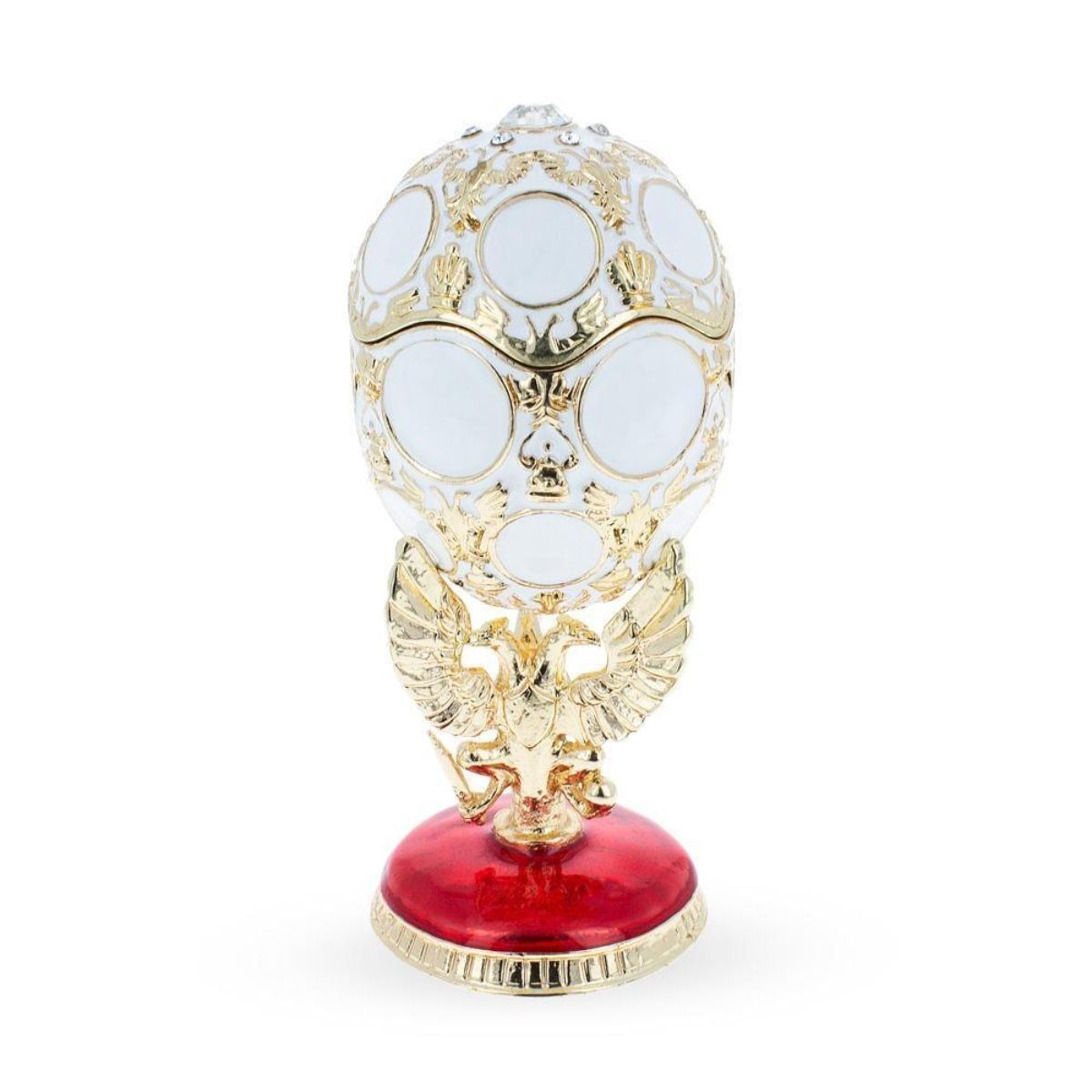 1913 Romanov Tercentenary Royal Russian Egg 3.6 Inches Tall (on a stand) x 1.6 Inches Wide 9.14 cm Tall (on a stand) x 4.06 cm Wide Enameled Gold Plated Pewter Hand Painted Gift Boxed This hand-painted sparkling egg is adorned with a high-polished green enamel with golden trim. It is decorated with light pink enameled roses and green leaves. This beauty stands on a golden stand. The egg opens on a hinge and closes shut with a magnet, to keep the box securely shut. The piece comes in a beautiful gift box. Egg History: Romanov Tercentenary Egg Year delivered 1913 Customer Nicholas II of Russia Recipient Alexandra Fedorovna Current owner Individual or institution Kremlin Armoury, Moscow Design and materials Workmaster Henrik Wigstrom Materials used gold, silver, diamond, rock crystal, enamel Rotating globe of historical and contemporary Russian territories The Romanov Tercentenary Egg is a jeweled Easter egg made under the supervision of the Russian jeweler Peter Carl Faberge in 1913, for Tsar Nicholas II of Russia. It was presented by Nicolas II as an Easter gift to his wife, the Tsaritsa Alexandra Fyodorovna. It is currently held in the Kremlin Armoury Museum in Moscow.  In 1917 the Romanov Tercentenary Egg was confiscated by the Provisional Government during the Russian Revolution, along with many other Imperial treasures. It was transported from the Anichkov Palace to the Kremlin Armoury, Moscow, where it remained.