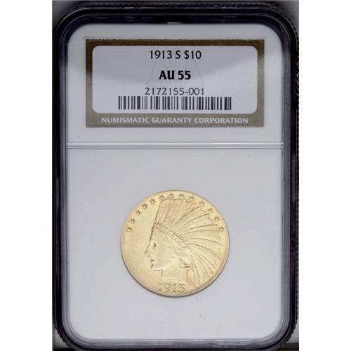 <B>1913-S<$10> AU55 NGC.</B></I> Fully lustrous with appealing reddish-gold toning and remarkably clean surfaces overall. Modest highpoint wear denies a Mint State assessment for this still pleasing Choice AU example.