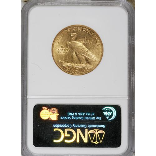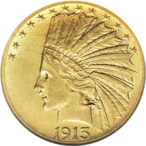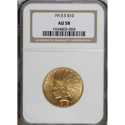 <B>1913-S $10 AU58 NGC.</B></I> In their recent book on U.S. gold coins, Jeff Garrett and Ron Guth (2006) write of the 1913-S ten dollar that it has been nudged out of top place in the Indian Head series by the 1911-D issue. Surviving high-grade specimens are still elusive, however. The high-end AU coin in this lot exhibits gorgeous brass-gold color and ample luster, and the design elements are generally well impressed. Smooth surfaces are the rule, save for a shallow curving mark in the left reverse field.<BR><BR><b>Shipping:</b> Coins & Currency (<a target="_blank" href="http://www.heritageauctions.com/common/shipping.php">view shipping information</a>)