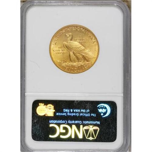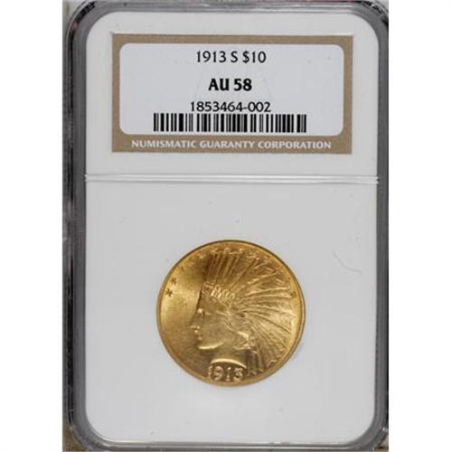 <B>1913-S $10 AU58 NGC.</B></I> The 1913-S is a key date of the pre-World War I portion of the series, since only 66,000 pieces were struck, and most exhibit signs of handling. The present representative displays unbroken cartwheel sheen, and evidence of friction is elusive. The reverse field is slightly subdued beneath TRUST.<BR><BR><b>Shipping:</b> Coins & Currency (<a target="_blank" href="http://www.heritageauctions.com/common/shipping.php">view shipping information</a>)
