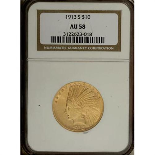<B>1913-S $10 AU58 NGC.</B></I> A few scattered abrasions appear under a loupe on both sides of this key-date Indian Head eagle, but the orange-gold surfaces, combined with frosty luster, nonetheless are commendable. This pretty piece would form a nice alternative to a much more pricey Mint State example.<BR><BR><B>Coin Engraver:</B> Augustus Saint-Gaudens<BR><BR><b>Shipping:</b> Coins & Currency (<a target="_blank" href="http://www.heritageauctions.com/common/shipping.php">view shipping information</a>)