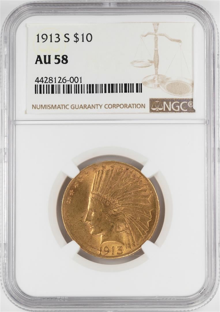 One 1913-S $10 Indian Head Eagle Gold Coin NGC AU58. NGC Certified.