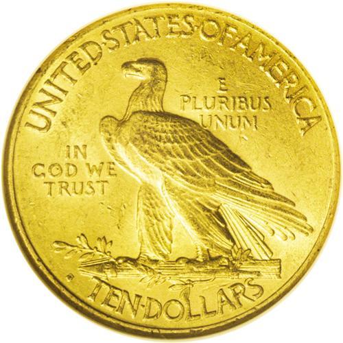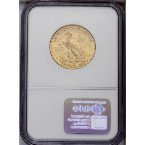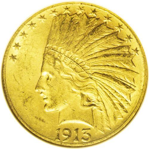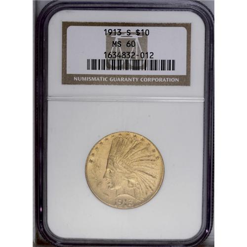 <B>1913-S<$10> MS60 NGC.</B></I> The former undisputed condition rarity in the Indian Head eagle series, now edged out by the 1911-D in top grades but still quite elusive in Mint State. Most certified pieces average in the AU55 range. This piece has numerous abrasions on Liberty's cheek and jawline and in the fields on both sides, with good luster and orange-gold surfaces. Census: 9 in 60, 87 finer (7/06).