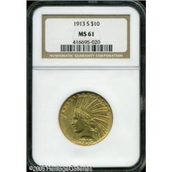 <B>1913-S $10 MS61 NGC.</B></I> A scarce mintmarked issue in the ten dollar Indian series and one that is seldom seen above the XF-AU level. This Mint State piece is sharply defined and surprisingly clean for the grade, but is noticeably lackluster. Lot:8879