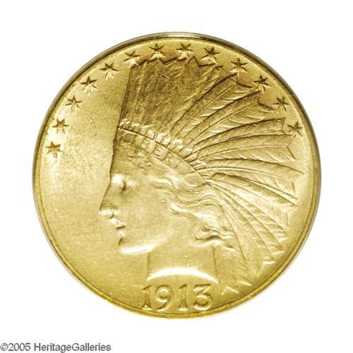 <B>1913-S<$10> MS62 PCGS.</B></I> The 1913-S, with a mintage of 66,000 pieces, is one of the most challenging issues of the Indian Head Eagle series. It is very scarce in any condition and, when one is available, XF or AU is likely to be the grade. In strictly Uncirculated condition the 1913-S is rare, and in Choice or Gem Mint State it is very rare. The example we offer here is apricot-gold in color with surfaces that emit soft luster. The design elements are nicely detailed, though the feathers on the eagle's left shoulder and leg are a touch weak. A reeding mark, along with a few other minor contact marks, are found on the Indian's face. A couple of more trivial abrasions are noticed on the eagle. Population: 40 in 62, 34 finer (11/05).