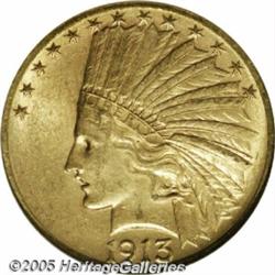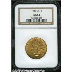 <B>1913-S $10 MS63 NGC.</B></I> The 1913-S is one of the premier rarities in the Indian Head Eagle series in all Mint State grades. Of the 66,000 pieces coined, most survivors grade no finer than VF-XF. Needless to say, the Select BU specimen that we highlight here represents a fleeting opportunity for advanced gold collectors. This is a deeply colored, copper-gold coin that deepens slightly around the devices. Boldly defined on both sides, the surfaces are lustrous and a few wispy abrasions away from a near-Gem grade. A premium quality coin for both the grade and the issue and a lot that should attract significant bidder attention. Population: 6 in 63, 15 finer (2/05).