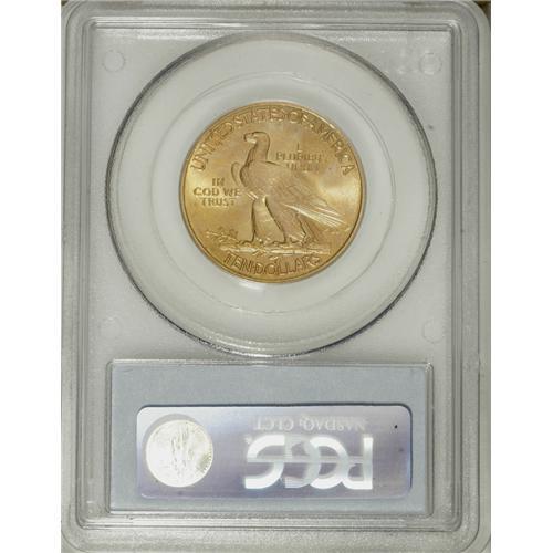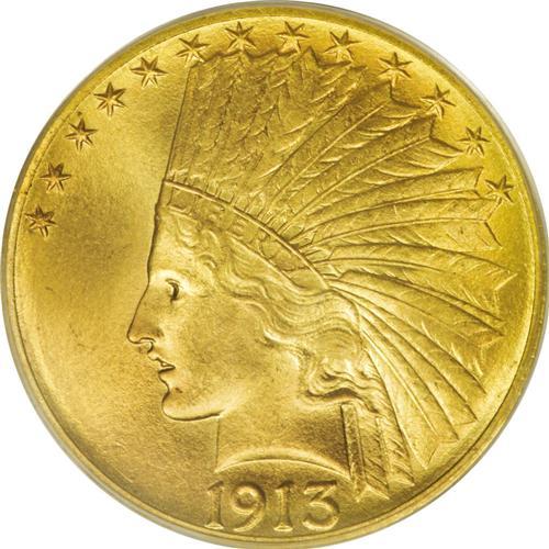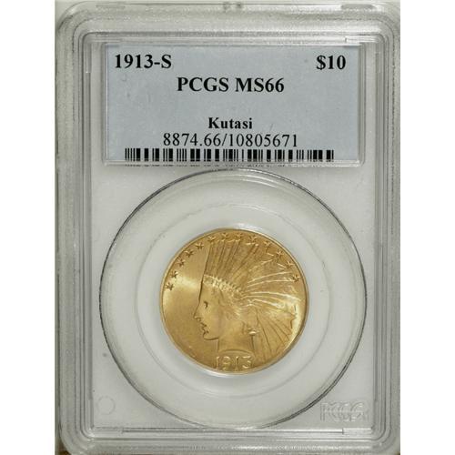 <B>1913-S $10 MS66 PCGS.</B></I> The first two sentences from the Garrett-Guth <I>Gold Encyclopedia</B></I> tell the story of high grade 1913-S eagles: "The 1913-S eagle was once the undisputed key to the series. Since the advent of certification, however, this premier condition rarity has been nudged out of top place by the 1911-D issue." For most collectors of this series, the issue of which issue is rarer is comparable to debating about how many angels can dance on the head of a pin. High grade examples are so rare of both that mind-boggling prices have been realized at public auction in recent years. As long ago as 1989, an MS65 brought $198,000. The last time an MS66 was sold was in 2000 in a Bowers sale, and that coin realized $71,300. Pricing data is obviously scarce and difficult for this rarely seen issue; however, a pair of MS67 coins (the only two certified MS67 examples) brought $200,000 and $143,750 via a Heritage private sale (2005) and Stack's (1/2004) auction respectively.<BR> Only 66,000 pieces were produced of the 1913-S and apparently a substantial percentage of that mintage was dropped into circulation as most of the coins known today are in VF to Choice AU condition. Lower-end Uncirculated coins are challenging in the absolute sense with only 100 or so pieces extant today in the MS60-62 grade range. A mere 24 coins have been certified in MS63, and this slight number gives one a sense of the rarity of the 1913-S in even higher grades. Such pieces are rarely seen, and when they available they are highlight coins in whatever auction in which they are offered.<BR> The present specimen was formerly one of two NGC coins graded MS67 maintained in the current population reports and which was last sold by Heritage to John Kutasi via the above-mentioned private sale for $200,000 in April 2005. It is now the sole MS66 example graded by PCGS. It is also important to note that this date was conspicuously absent in Gem grades from other notable ten dollar Indian collections such as Price, Duckor, and Kruthoffer, which had MS63 examples of this key date.<BR> The surfaces show a lovely overlay of light orange-gold color with a mixture of lilac on the reverse. Each side is evenly covered with matte-like granularity with an overlay of soft, frosted mint luster. The only mark of note is a short, shallow check-mark near the rim at 7 o'clock on the obverse.<BR> Once again quoting from the Garrett-Guth reference: "Any Indian Head eagle collection would be truly defined by the presence of both a 1913-S and a 1911-D issue." This is a colossal ten dollar Indian whose condition would be noteworthy even if it were dated 1932. The fact it is one of the rarest and most famous issues of this popular series will make this a coin that will be remembered for many years to come.<BR><I>Used as the plate coin in</B></I> The Coinage of Augustus Saint-Gaudens as Illustrated by the Phillip Morse Collection.<BR><I>From The Kutasi Collection.</B></I><BR><BR><b>Shipping:</b> Coin/Currency (<a target="_blank" href="http://www.heritageauctions.com/common/shipping.php">view shipping information</a>)