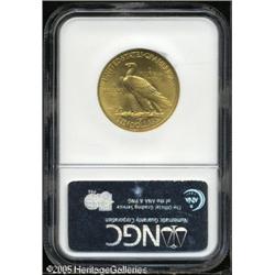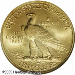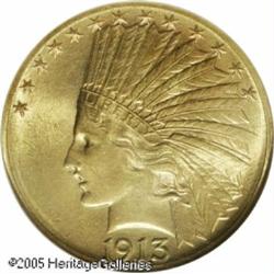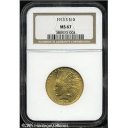 <B>1913-S $10 MS67 NGC.</B></I> With an original mintage of just 66,000 pieces, the 1913-S is one of the rarest dates of the Indian Head eagle series. It is scarce in any condition, with most survivors seemingly in VF or XF grades. In Uncirculated condition, the '13-S is rare, and in Choice or Gem it is very rare. Indeed, Akers considers the '13-S "extremely difficult, if not virtually impossible, to obtain in MS64 or better condition...Nearly everyone collecting Indian Head eagles, past or present, needs a choice example of this issue, and there are no more than a half dozen or so in MS64 or better condition to go around." This estimate includes the specimens that are impounded or already in major collections.<BR> Of the 192 Mint State 1913-S eagles certified by NGC and PCGS combined, only two have attained the lofty grade of MS67, with none finer (1/05). Both examples were certified by NGC. One of these specimens was from the William Thomas Michaels Collection, sold in Stack's January 21, 2004 sale as lot 3021, where it realized $143,750. The other Superb Gem '13-S, which we offer in this lot, displays a crisp strike, with bold definition noted on all of the design elements, including the Indian's hair and headress feathers, and on the eagle's feathers. The surfaces are covered in frosty luster, overlain by warm peach-gold patina with subtle greenish and faded reddish accents, and are exquisitely preserved. Just one tiny mark is apparent in the lower left obverse field, along with a few well-concealed marks in the middle and lower portions of the eagle's left wing.<BR> This is a truly rare opportunity for the connoisseur of U.S. gold coinage to acquire one of the finest known '13-S eagles. One can only speculate on when a coin of this caliber will reappear on the market. Lot:8880