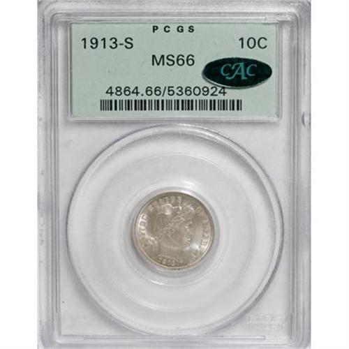 <B>1913-S 10C MS66 PCGS. CAC.</B></I> Whispers of silver-blue and champagne patina drape the shining surfaces of this elegant Premium Gem. Exceptional visual appeal and preservation. Housed in a green label holder. Population: 17 in 66, 4 finer (1/08).<BR><BR><B>Coin Engraver:</B> Charles E. Barber<BR><BR><b>Shipping:</b> Coins & Currency (<a target="_blank" href="http://www.heritageauctions.com/common/shipping.php">view shipping information</a>)