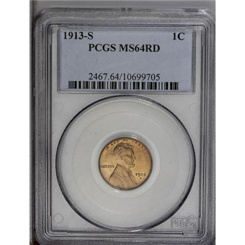<B>1913-S<1C> MS64 Red PCGS.</B></I> A lovely piece with original orange-red color and few marks. Generally well struck, though the upper left of the O in ONE is weak to the point of nonexistence.