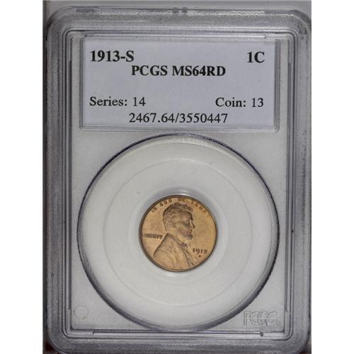 <B>1913-S<1C> MS64 Red PCGS.</B></I> The pretty copper-red fields have auburn accents. A solidly struck near-Gem that has small abrasions on each side that restrict the grade.