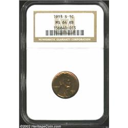 1913-S 1C MS64 Red and Brown NGC. The lovely tan-brown surfaces retain rich cartwheel luster. A nicely struck near-Gem of this early lower mintage mintmarked issue. The obverse is particularly well preserved.From the Robert Tarr, Sr. Collection. Important notice: We expect to be auctioning lots at the rate of 200-250 per hour. Sometimes eBay Premier live bid software cannot keep up with that pace, so we strongly recommend that you place a realistic proxy bid now as insurance to avoid disappointment. Also please note that all Heritage/CAA lots purchased through eBay Premier carry a 20% Buyer's Premium. Please make sure you read the Terms and Conditions.