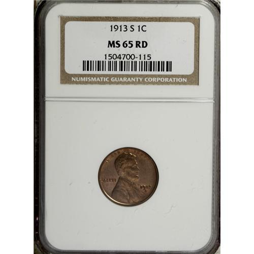 <B>1913-S 1C MS65 Red NGC.</B></I> One of the tough S-mint dates in Uncirculated, among the first of a long string of difficult mintmarked issues. One could quibble over whether this is considered a key or a semikey, but in Gem Red condition it is always valued, and there are far too few examples for the collectors seeking one. This piece has well-struck, light tan-red surfaces, with good luster and no impairments, save for a hint of softness on the 3 in the date. A tiny reverse die crack joins the right (facing) wheat ear to the rim. Among the finest at NGC. Census: 16 in 65 Red, 0 finer (12/06).<BR><BR><b>Shipping:</b> Coin/Currency (<a target="_blank" href="http://www.heritageauctions.com/common/shipping.php">view shipping information</a>)
