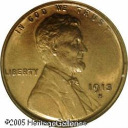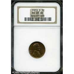 <B>1913-S 1C MS65 Red NGC.</B></I> The lustrous surfaces present a somewhat glossy appearance and are a medium reddish-tan color. The obverse is well defined, some slight weakness is seen on the O of ONE on the reverse. Bright and unspotted. Population: 15 in 65, 0 finer (1/05). Lot:5411
