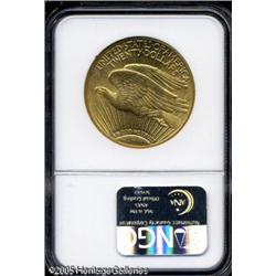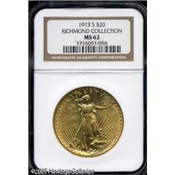 <B>1913-S $20 MS62 NGC.</B></I> Ex: Richmond Collection. A lustrous example of this popular S-mint issue. The strike is sharp aside from the Capitol building. The rich apricot-gold fields are lightly marked. Lot:9539