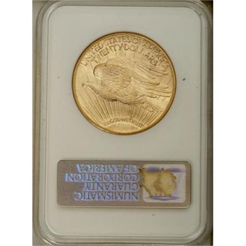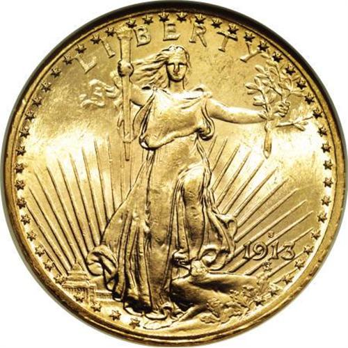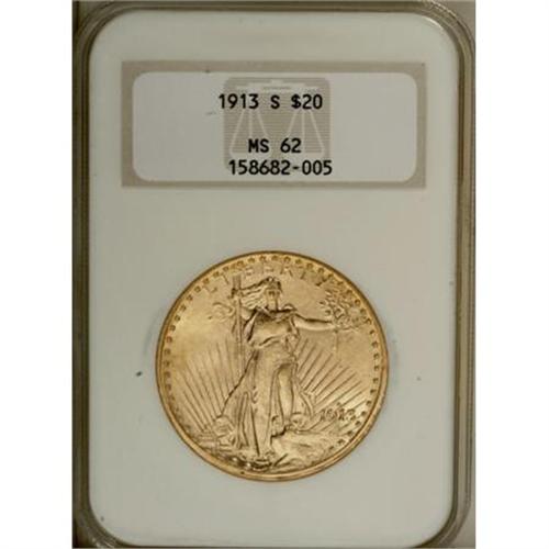 <B>1913-S $20 MS62 NGC.</B></I> This issue tends to be plagued by incomplete strike and copper stains. This MS62 coin displays bright brassy-gold surfaces with nice luster. A well executed strike sharpens the Capitol building, Liberty's facial features, the fingers and toes, and the eagle's feathers. A few luster grazes are visible, but copper stains are absent.<BR><BR><B>Coin Engraver:</B> Augustus Saint-Gaudens<BR><BR><b>Shipping:</b> Coins & Currency (<a target="_blank" href="http://www.heritageauctions.com/common/shipping.php">view shipping information</a>)