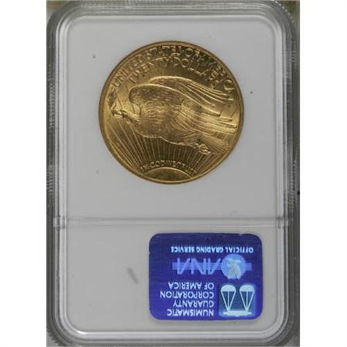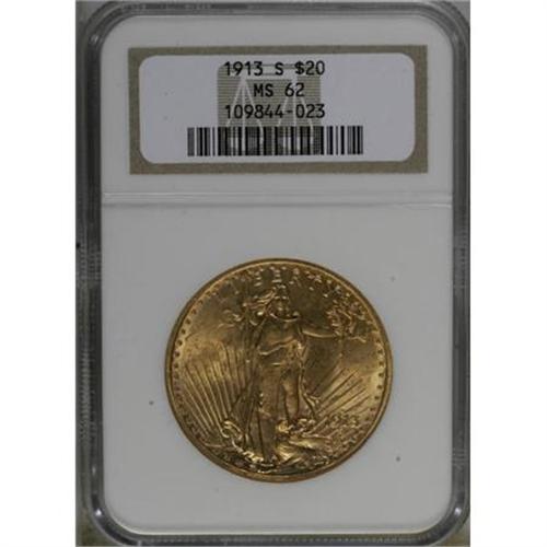 <B>1913-S $20 MS62 NGC.</B></I> This well-defined piece, yellow-gold with occasional lilac overtones, shows none of the copper spotting that often appears on survivors from this issue of just 34,000 pieces. The fields are pleasing for the grade assigned, though a single significant abrasion at Liberty's waist precludes Select status.<BR><BR><B>Coin Engraver:</B> Augustus Saint-Gaudens<BR><BR><b>Shipping:</b> Coins & Currency (<a target="_blank" href="http://www.heritageauctions.com/common/shipping.php">view shipping information</a>)