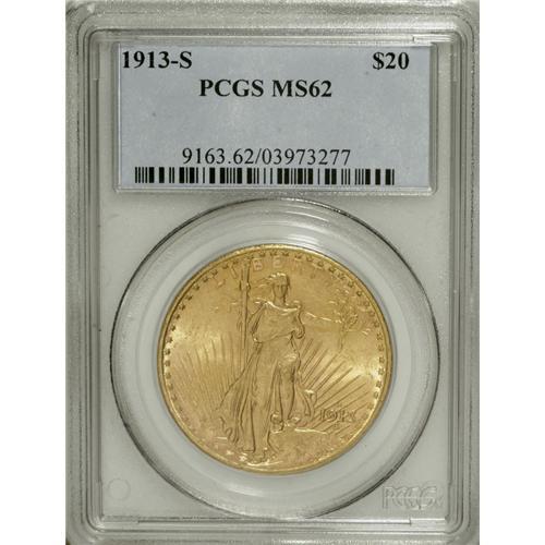 <B>1913-S $20 MS62 PCGS.</B></I> Original orange and lime tints alternate across this lustrous and carefully preserved better date twenty. The Capitol building is softly impressed, but the major devices are suitably struck. The mintage for the 1913-S is only 34,000 pieces, and the issue is often the target of hoarders and speculators.<BR><I>From The Greg Southward Collection.</B></I><BR><BR><b>Shipping:</b> Coins & Currency (<a target="_blank" href="http://www.heritageauctions.com/common/shipping.php">view shipping information</a>)