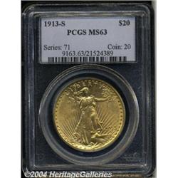 <B>1913-S<$20> MS63 PCGS.</B></I> Lovely reddish-orange patina dominates both sides of this well defined and lustrous example. A few minor handling marks are expected of the grade. Only 34,000 pieces were struck, the lowest of the Motto issues except for the 1908-S. <BR><BR><B>Important notice:</B> Heritage usually auctions material at the rate of 200-250 lots per hour. On some occasions eBay Live bid software or the Internet may not be able to keep up with the pace of the auction. We recommend placing a realistic absentee bid now as insurance to avoid disappointment. Occasionally the auctioneer may eliminate or reject an eBay Live bid, and the auctioneer may also reopen a lot after the close of the eBay live bidding (usually because we missed an audience bid), and may reject your bid even if it shows you as the winning bidder. By bidding via eBay Live, you agree that Heritage may award the lot to another bidder at its sole discretion under the circumstances described above or any other reasonable circumstances. Since eBay bids are not shown to us until we open the lot on the floor, we treat those bids just like floor bids. In most cases the floor responds before the eBay bid is presented to us, due to Internet lag time, so for consistency we have made it a policy that floor bids are always considered first over tie eBay live bids. Also please note that all Heritage lots purchased through eBay Live carry a 20% Buyer's Premium. Please make sure you read the Terms and Conditions before you bid. </span></font></tr></table></td></tr></table>