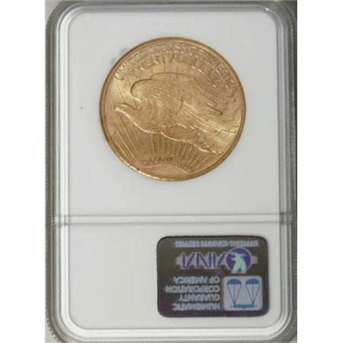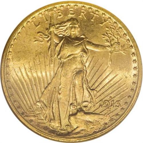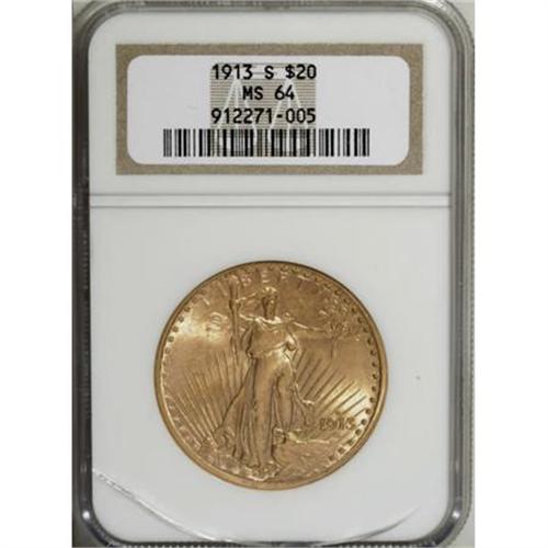 <B>1913-S $20 MS64 NGC.</B></I> Choice Mint State examples of this date represent the finest quality that remains at affordable levels as Gem specimens are great condition rarities. NGC and PCGS have graded nearly 700 MS64 pieces, but only 27 coins in higher grades. Consider this grade as the optimum collecting opportunity. Frosty yellow-gold luster is accompanied by pleasing orange toning.<BR><BR><B>Coin Engraver:</B> Augustus Saint-Gaudens<BR><BR><b>Shipping:</b> Coins & Currency (<a target="_blank" href="http://www.heritageauctions.com/common/shipping.php">view shipping information</a>\)