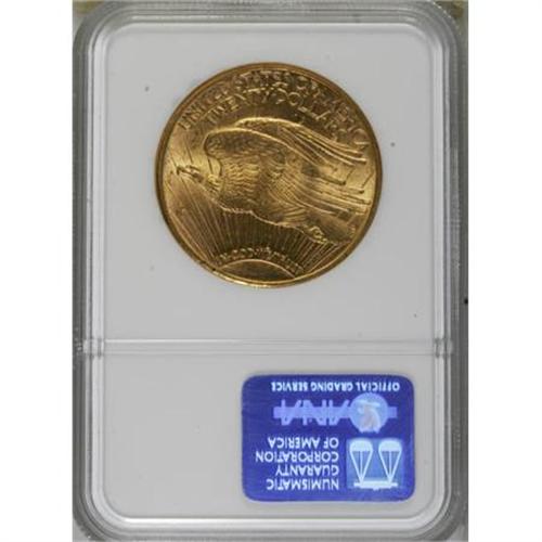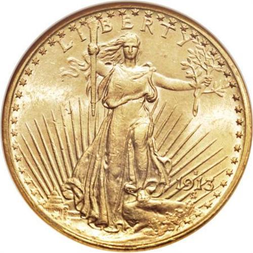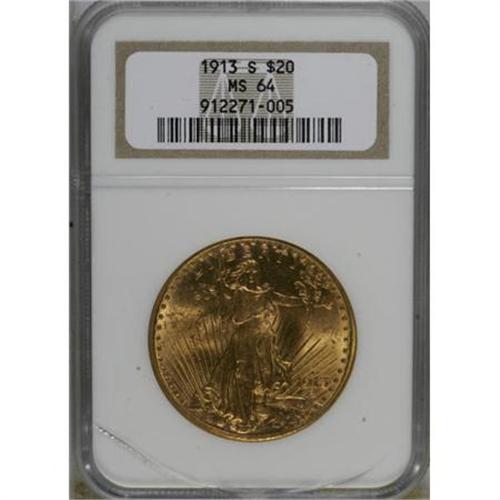 <B>1913-S $20 MS64 NGC.</B></I> Choice Mint State examples of this date represent the finest quality that remains at affordable levels, as Gem specimens are great condition rarities; NGC and PCGS have graded just 27 such coins between them (3/08). This shining yellow-gold piece is well struck and minimally marked with occasional orange accents near the margins.<BR><BR><B>Coin Engraver:</B> Augustus Saint-Gaudens<BR><BR><b>Shipping:</b> Coins & Currency (<a target="_blank" href="http://www.heritageauctions.com/common/shipping.php">view shipping information</a>)