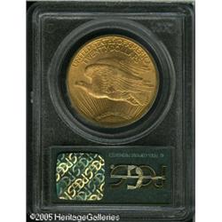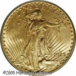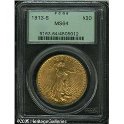 <B>1913-S $20 MS64 PCGS.</B></I> A crisp strike and rich orange-gold patina are the hallmarks of this lustrous near-Gem. The obverse side has a few mentionable luster grazes typical of the grade, while the reverse field is somewhat cleaner. With its mintage of just 34,000 pieces, the 1913-S has long been a popular issue for hoarders and speculators. Lot:9544