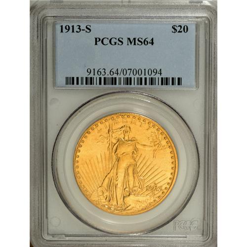<B>1913-S $20 MS64 PCGS.</B></I> Among the With Motto double eagles, both of the lowest-mintage issues came from San Francisco, and the one with the greater population, the 1913-S, is represented here by a suitably struck and brassy lemon-gold example. A number of marks that pepper the fields are commensurate with the grade.<BR><BR><b>Shipping:</b> Coin/Currency (<a target="_blank" href="http://www.heritageauctions.com/common/shipping.php">view shipping information</a>)