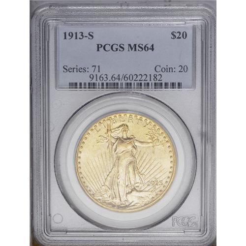 "1913-S $20 MS64 PCGS. Bright, lustrous,"
