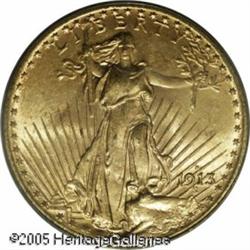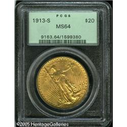 <B>1913-S $20 MS64 PCGS.</B></I> Bright orange-gold in color with strong luster in the fields. Fully struck as usual for this date, and the surfaces are very pleasing for the grade. This is a condition rarity which is all but unobtainable finer. Close examination of the surfaces finds little to fault this piece, and any collector can appreciate the charms of this elusive issue. Housed in an older green insert PCGS holder. Population: 341 in 64, 14 finer (1/05). Lot:9543
