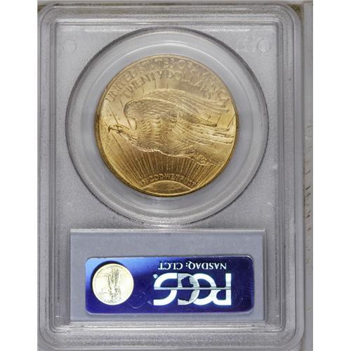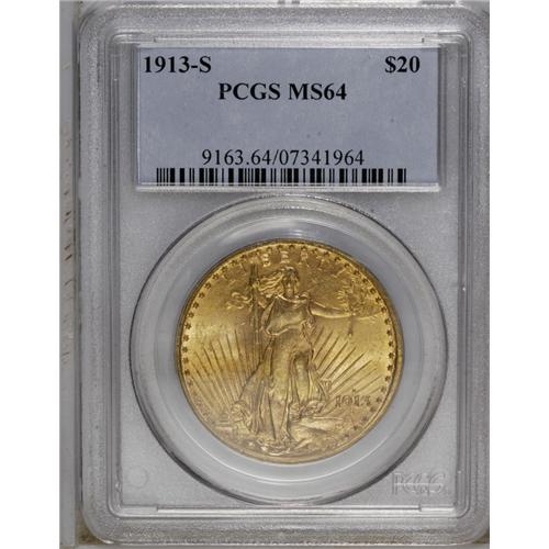 <B>1913-S<$20> MS64 PCGS.</B></I> Bright satiny luster highlights light green-gold and terra cotta toning. The striking details are beyond reproach, and both sides display only slight abrasions. The original mintage of 34,000 pieces is the third lowest in the Saint-Gaudens series. Very scarce any finer.