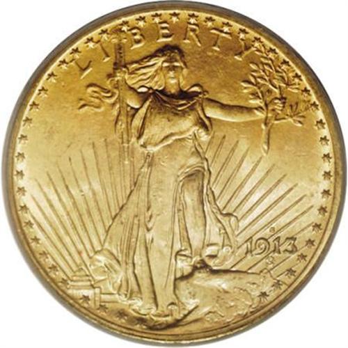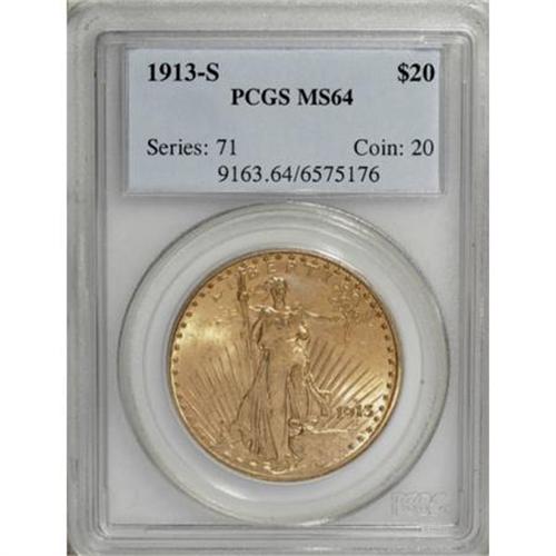 <B>1913-S $20 MS64 PCGS.</B></I> Advanced specialists and Set Registry collectors will want to participate in this sale to acquire the present Choice Mint State piece. It has lovely orange-gold luster with frosty surfaces and great eye appeal. Just 20 finer examples of this desirable date have been certified by PCGS.<BR><I>From The DAX Collection.</B></I><BR><BR><B>Coin Engraver:</B> Augustus Saint-Gaudens<BR><BR><b>Shipping:</b> Coins & Currency (<a target="_blank" href="http://www.heritageauctions.com/common/shipping.php">view shipping information</a>\)
