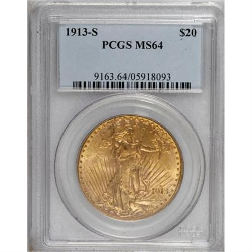 <B>1913-S $20 MS64 PCGS.</B></I> Frosty and lustrous yellow-gold surfaces have a few tiny bagmarks that are consistent with the grade. The 1913-S double eagle is a low-mintage rarity that is seldom found in Gem quality. This near-Gem specimen should satisfy the desires of nearly every collector. PCGS has only certified 20 finer examples, and most of those are held tightly by advanced specialists.<BR><BR><B>Coin Engraver:</B> Augustus Saint-Gaudens<BR><BR><b>Shipping:</b> Coins & Currency (<a target="_blank" href="http://www.heritageauctions.com/common/shipping.php">view shipping information</a>)