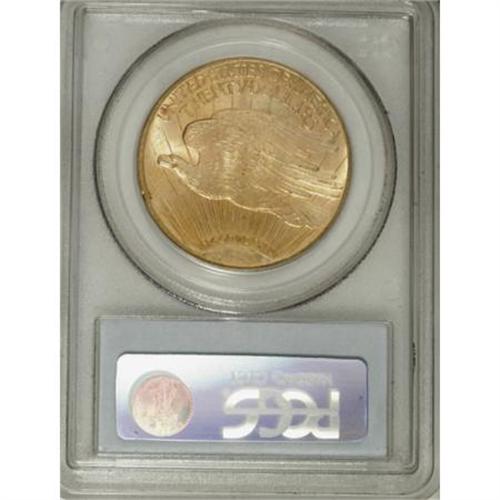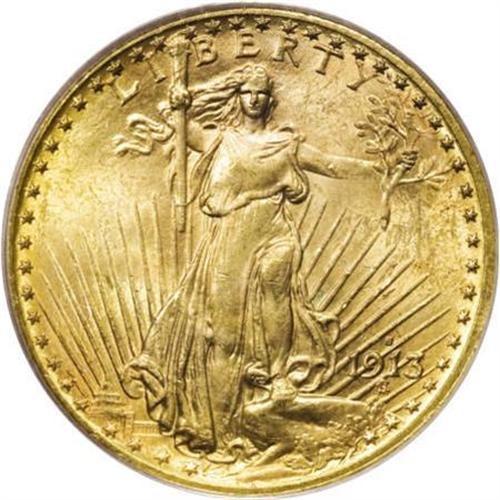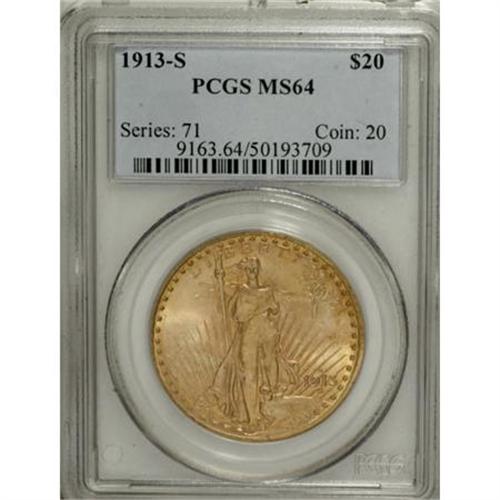 <B>1913-S $20 MS64 PCGS.</B></I> One of just 34,000 pieces struck, this lustrous, slightly hazy near-Gem is almost uniformly apricot-gold with none of the obvious copper spotting found on numerous examples of this issue. Well-defined with few marks and strong eye appeal. The collector who would purchase something better may have a long wait ahead; Garrett and Guth (2006) write that "fully struck MS64 coins can be obtained," but Gems are "very rare indeed." PCGS has certified just 20 finer pieces (9/07).<BR><BR><B>Coin Engraver:</B> Augustus Saint-Gaudens<BR><BR><b>Shipping:</b> Coins & Currency (<a target="_blank" href="http://www.heritageauctions.com/common/shipping.php">view shipping information</a>)