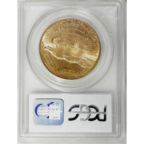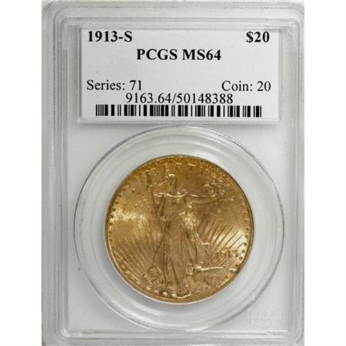 <B>1913-S $20 MS64 PCGS.</B></I> Strongly lustrous with vivid orange-gold surfaces. Although the Capitol building is softly defined, the other design elements are bold. Minor field marks limit the grade. Only 34,000 pieces were struck for this widely hoarded issue. No double eagles were struck at San Francisco in 1912, the first such gap in that Mint's production since 1886.<BR><I>From The Jacob Collection of Saint-Gaudens Double Eagles.</B></I><BR><BR><B>Coin Engraver:</B> Augustus Saint-Gaudens<BR><BR><b>Shipping:</b> Coins & Currency (<a target="_blank" href="http://www.heritageauctions.com/common/shipping.php">view shipping information</a>)