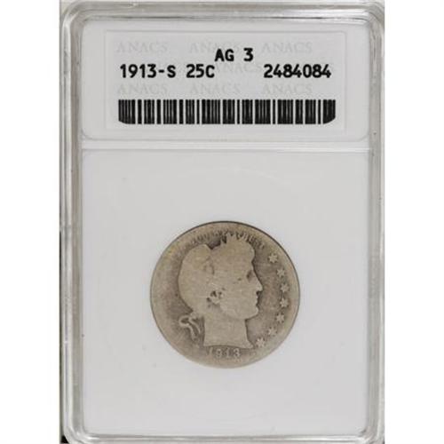 <B>1913-S 25C AG3 ANACS.</B></I> Gold, violet, and silver-gray are the major attributes of this heavily worn, yet highly desirable Barber quarter key. The left stars and right edge lettering are gone, yet the date and mintmark are clear.<BR><BR><B>Coin Engraver:</B> Charles E. Barber<BR><BR><b>Shipping:</b> Coins & Currency (<a target="_blank" href="http://www.heritageauctions.com/common/shipping.php">view shipping information</a>)