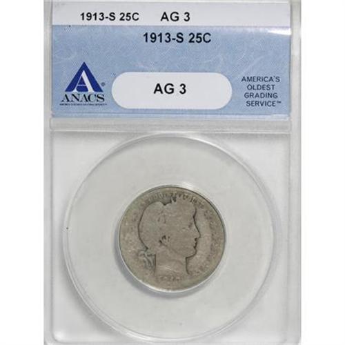 <B>1913-S 25C AG3 ANACS.</B></I> Though the lower left and right rims have merged with the lettering, the more central elements of this coin, including the date and mintmark, remain clearly outlined. A pleasing, minimally abraded About Good example of this popular key issue.<BR><BR><B>Coin Engraver:</B> Charles E. Barber<BR><BR><b>Shipping:</b> Coins & Currency (<a target="_blank" href="http://www.heritageauctions.com/common/shipping.php">view shipping information</a>)