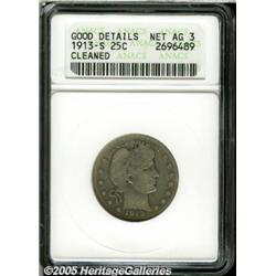 <B>1913-S 25C --Cleaned--ANACS. Good Details, Net AG3.</B></I> This key date Barber has unnaturally bright surfaces for the grade, and displays a few wispy hairlines. Yet it does not portray a "washed out" appearance, as can sometimes be the case on low grade coins that are cleaned.