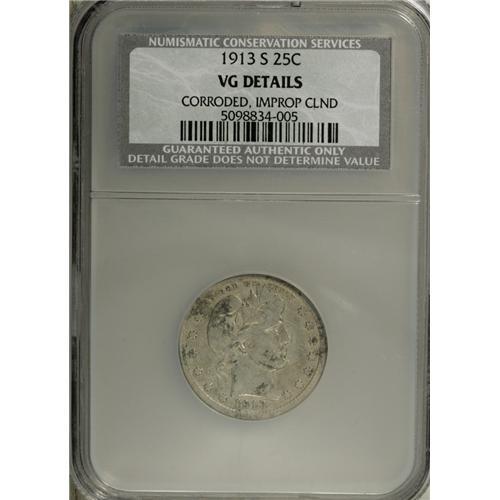 <B>1913-S 25C --Corroded, Improperly Cleaned--VG Details.</B></I> Patches of deep green corrosion are scattered on the obverse and the right reverse field of this significantly worn key-date quarter. The glossy pearl-gray surfaces have a number of light hairlines and scratches.<BR><BR><b>Shipping:</b> Coin/Currency (<a target="_blank" href="http://www.heritageauctions.com/common/shipping.php">view shipping information</a>)