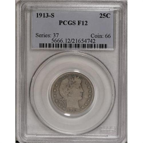 <B>1913-S 25C Fine 12 PCGS.</B></I> Pleasing uniformly light gray patina rests on the remarkably clean surfaces of this key-date '13-S quarter. The date and mintmark are strong, and the rims are complete. The LI and Y of LIBERTY show, as does the upper part of the T. The lowest mintage of the Barber quarter series (40,000 pieces).<BR><BR><B>Coin Engraver:</B> Charles E. Barber<BR><BR><b>Shipping:</b> Coins & Currency (<a target="_blank" href="http://www.heritageauctions.com/common/shipping.php">view shipping information</a>)