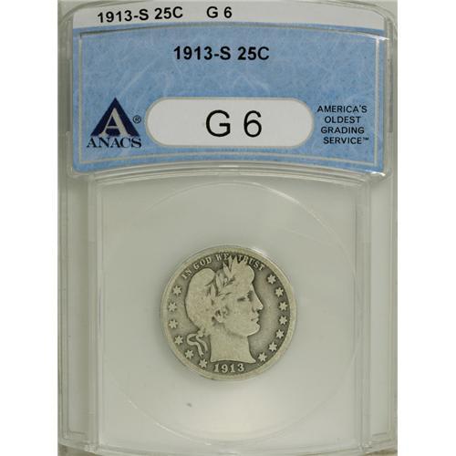 <B>1913-S 25C Good 6 ANACS.</B></I> This is a totally original key-date quarter. Exceptionally clean light gray surfaces take on slightly deeper shades in the areas around, and in the interstices of, the design elements. Both rims are complete, with the exception of a small area in the lower right reverse quadrant. The LI and TY of LIBERTY show, as do the URIB and UN of the reverse motto. It is difficult to imagine that one could come up with a more pleasing low-grade specimen.<BR><I>From The Edward Sacks Collection.</B></I><BR><BR><b>Shipping:</b> Coins & Currency (<a target="_blank" href="http://www.heritageauctions.com/common/shipping.php">view shipping information</a>)