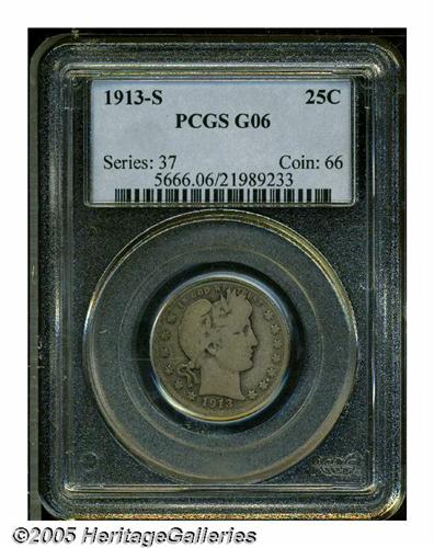 <B>1913-S<25C> Good 6 PCGS.</B></I> Well detailed with apricot-red and dove-gray toning, and a few wispy pinscratches on the otherwise smooth obverse and reverse surfaces. The 1913-S Barber Quarter boasts the lowest mintage of any regular minor issue from the 20th Century (40,000 pieces).