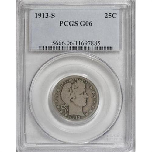 <B>1913-S 25C Good 6 PCGS.</B></I> Delicate rose-violet patina graces the surfaces of this heavily circulated key-date quarter, one of just 40,000 examples struck for the issue. Minimally marked with the letters L and Y still visible on Liberty's headband.<BR><BR><b>Shipping:</b> Coins & Currency (<a target="_blank" href="http://www.heritageauctions.com/common/shipping.php">view shipping information</a>)