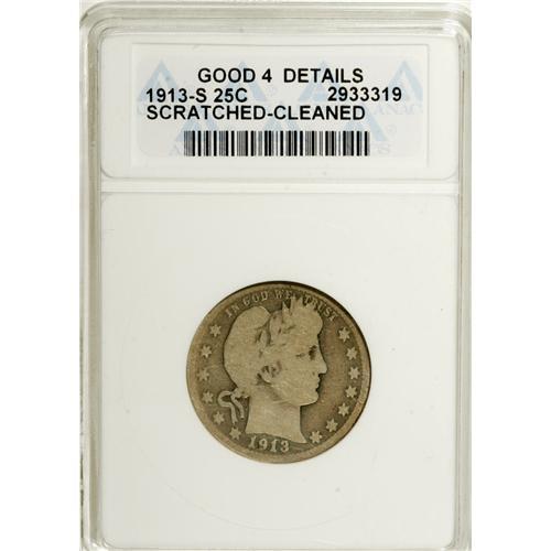 <B>1913-S 25C --Scratched, Cleaned--ANACS. Good 4 Details.</B></I> Evenly worn with light pinkish-gray color and a faintly bright appearance from improper cleaning. A couple of heavy scratches are noted across the obverse.<BR><I>From The Dale A. Konigsburg Collection, Part Two.</B></I><BR><BR><b>Shipping:</b> Coins & Currency (<a target="_blank" href="http://www.heritageauctions.com/common/shipping.php">view shipping information</a>)