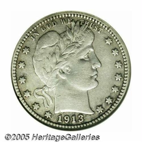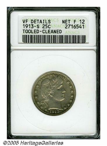 <B>1913-S<25C>--Tooled, Cleaned--ANACS. VF Details, Net Fine 12.</B></I> Light gray surfaces reveal darker accent toward the borders and fine hairline scratches, most noticeable on the obverse. A key date in the Barber Quarter series.